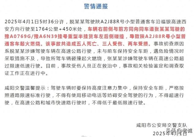 2025年4月1日5时36分许,咸阳福银高速上演了令人窒息的一幕!一辆载满乘客的小客车像失控的炮弹般撞上大货车,瞬间火光冲天。5条鲜活的生命被大火吞噬,3名伤者躺在医院浑身插满管子,这样的惨剧看得人手脚发凉!